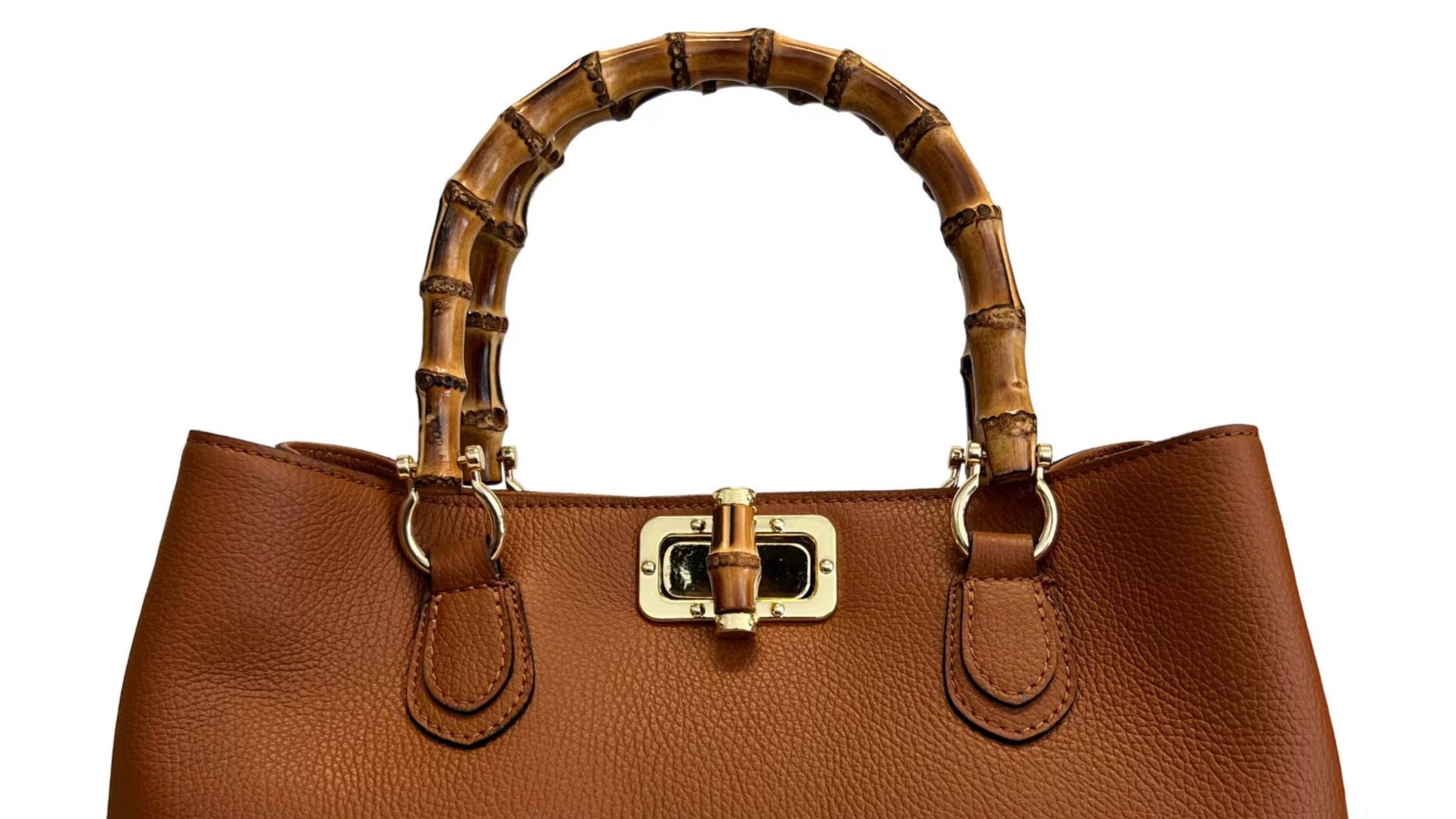 Genuine Leather large Caramel day handbag with real bamboo handle, crafted in Italy