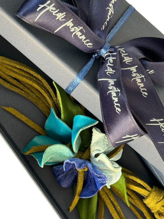 Our striking colourful leather floral jewellery is handmade. Each piece hand cut and carefully crafted.A beautiful accessory to brighten up any outfit. If you have a very special occasion and would like a bespoke piece made, please do contact us or ask in our Lifestyle shop.