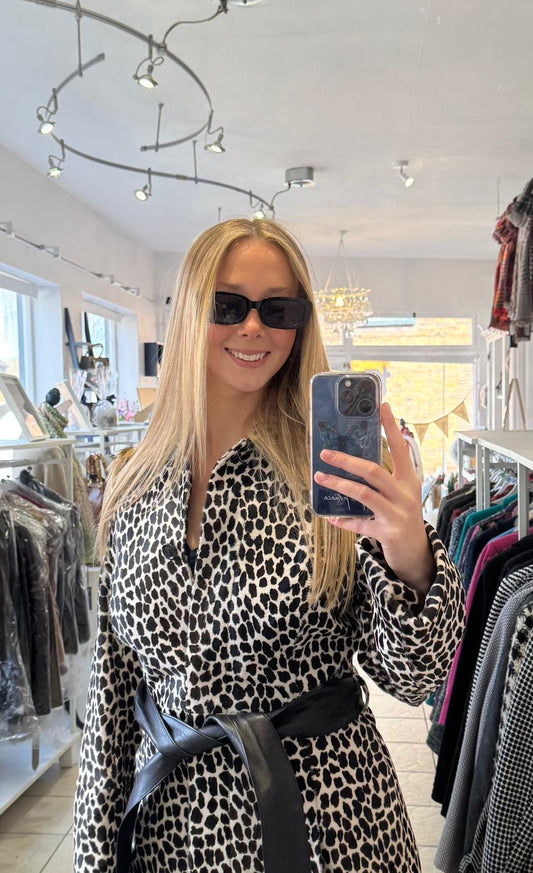 Victoria Long Coat with Leather Tie, Printed Cow Hide
