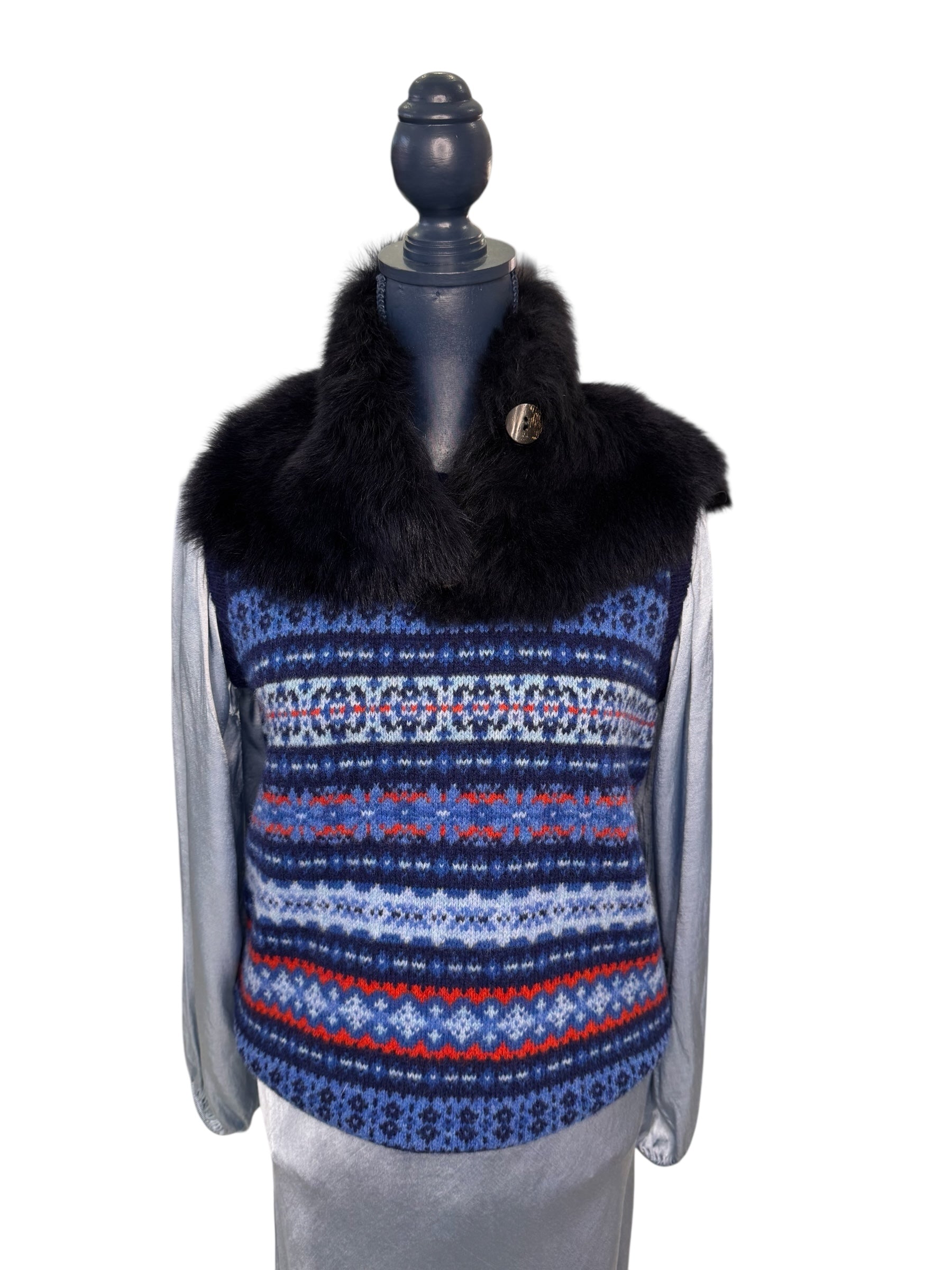 This Ladies 2 ply crew neck super soft signature slipover in our own colourway features a multicoloured geometric pattern, meticulously crafted by skilled artisans in Great Britain. Made from 100% pure wool, this piece must be hand-washed for care and maintenance.